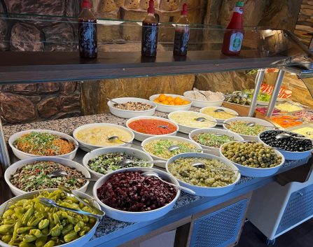 Hummus, tzatziki, viinilehtikääryle, munakoisosalaatti, fetakääryle, oliivi, oliiviöljy